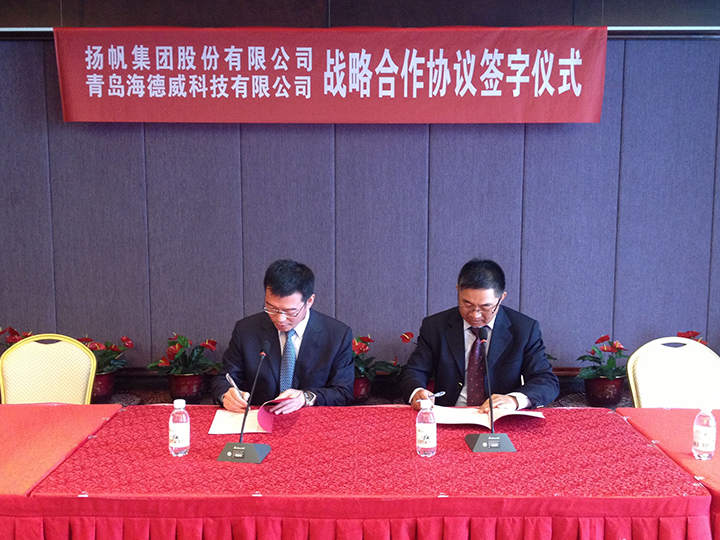 本著平等互利,共同發(fā)展的原則,4月25日,揚(yáng)帆集團(tuán)股份有限公司與青島海德威科技有限公司簽訂了戰(zhàn)略合作協(xié)議。由雙方代表?yè)P(yáng)帆集團(tuán)董事長(zhǎng)李明東和海德威CEO曹學(xué)良在合同上簽字。