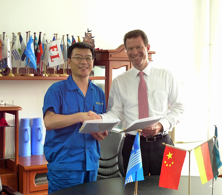 6月24日,集團(tuán)公司與GL船級社就35900噸散貨船5號船和6號船簽訂了船檢檢驗(yàn)合同,集團(tuán)董事長李明東和GL亞太區(qū)總裁Mr.Lund分別代表雙方在合同上進(jìn)行簽字。