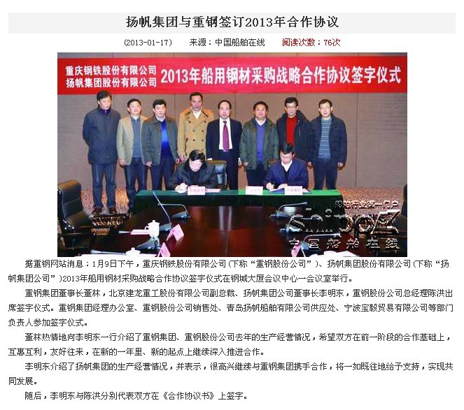中國船舶在線:揚(yáng)帆集團(tuán)與重鋼簽訂2013年合作協(xié)